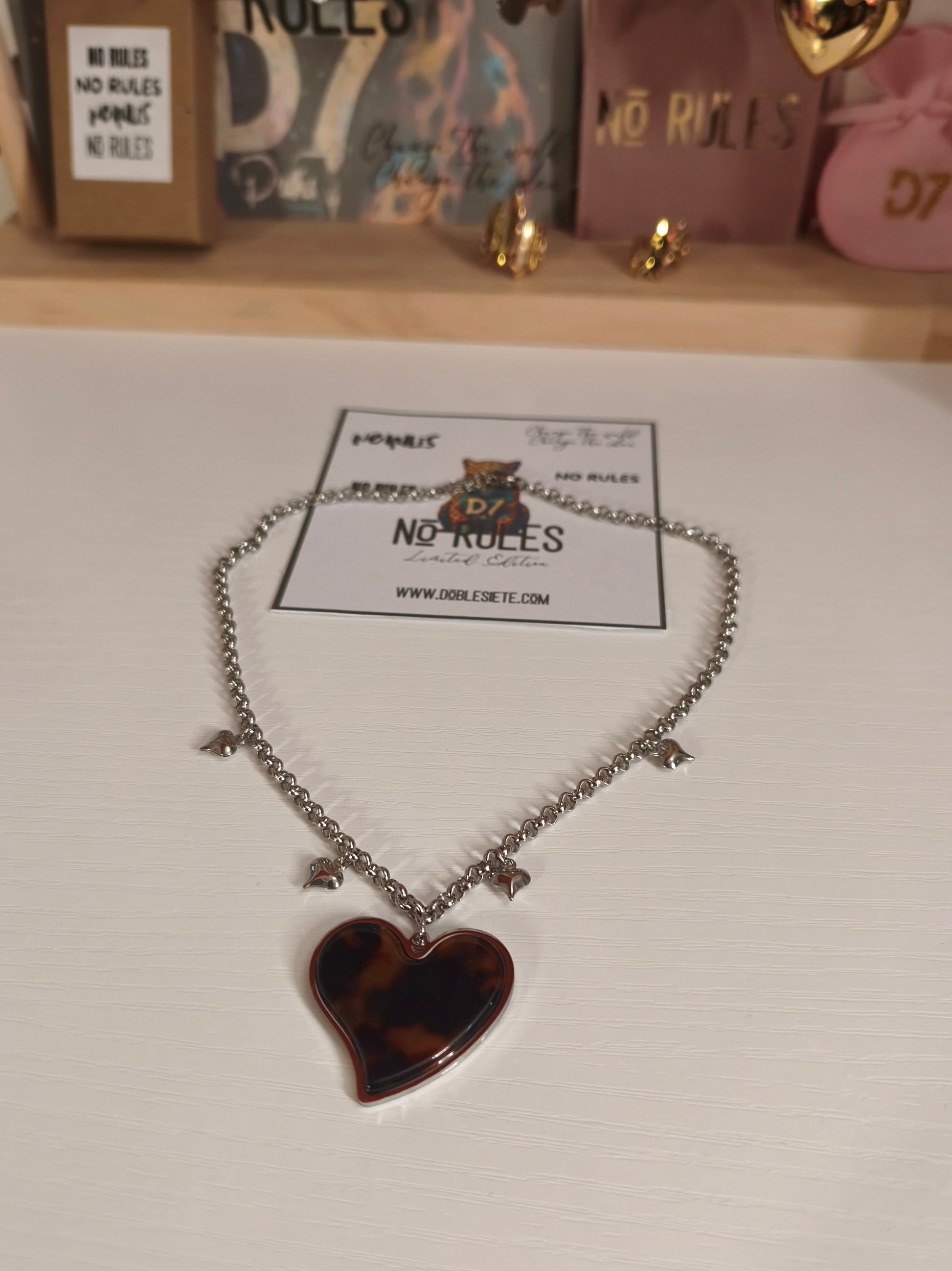 Collar de acero inoxidable con colgante en forma de corazón estampado con patrón leopardo. Diseño de la colección NR No Rules que combina elegancia con un toque salvaje y desenfadado. La cadena de acero garantiza durabilidad y resistencia al paso del tiempo, mientras que el acabado pulido mantiene su brillo original. Pieza versátil que se adapta tanto a looks casuales como a outfits más sofisticados. Ideal para quienes buscan expresar su personalidad a través de accesorios con carácter.