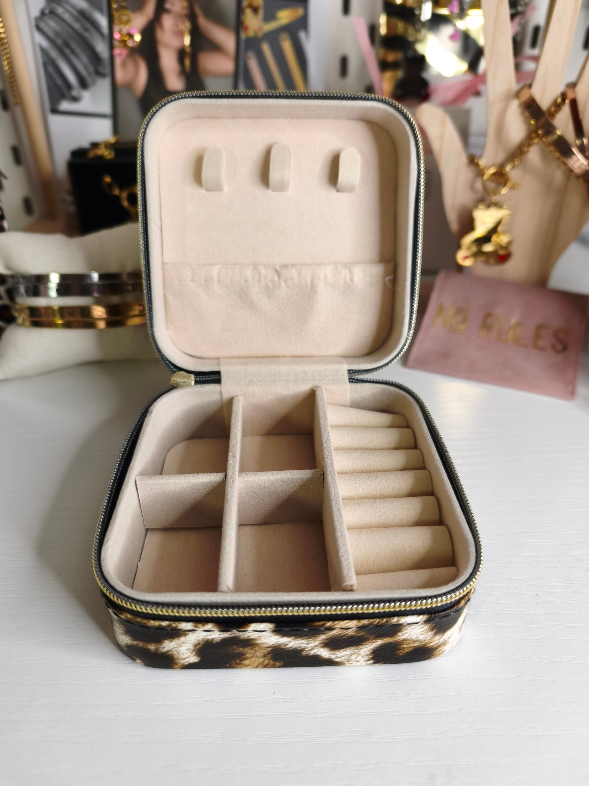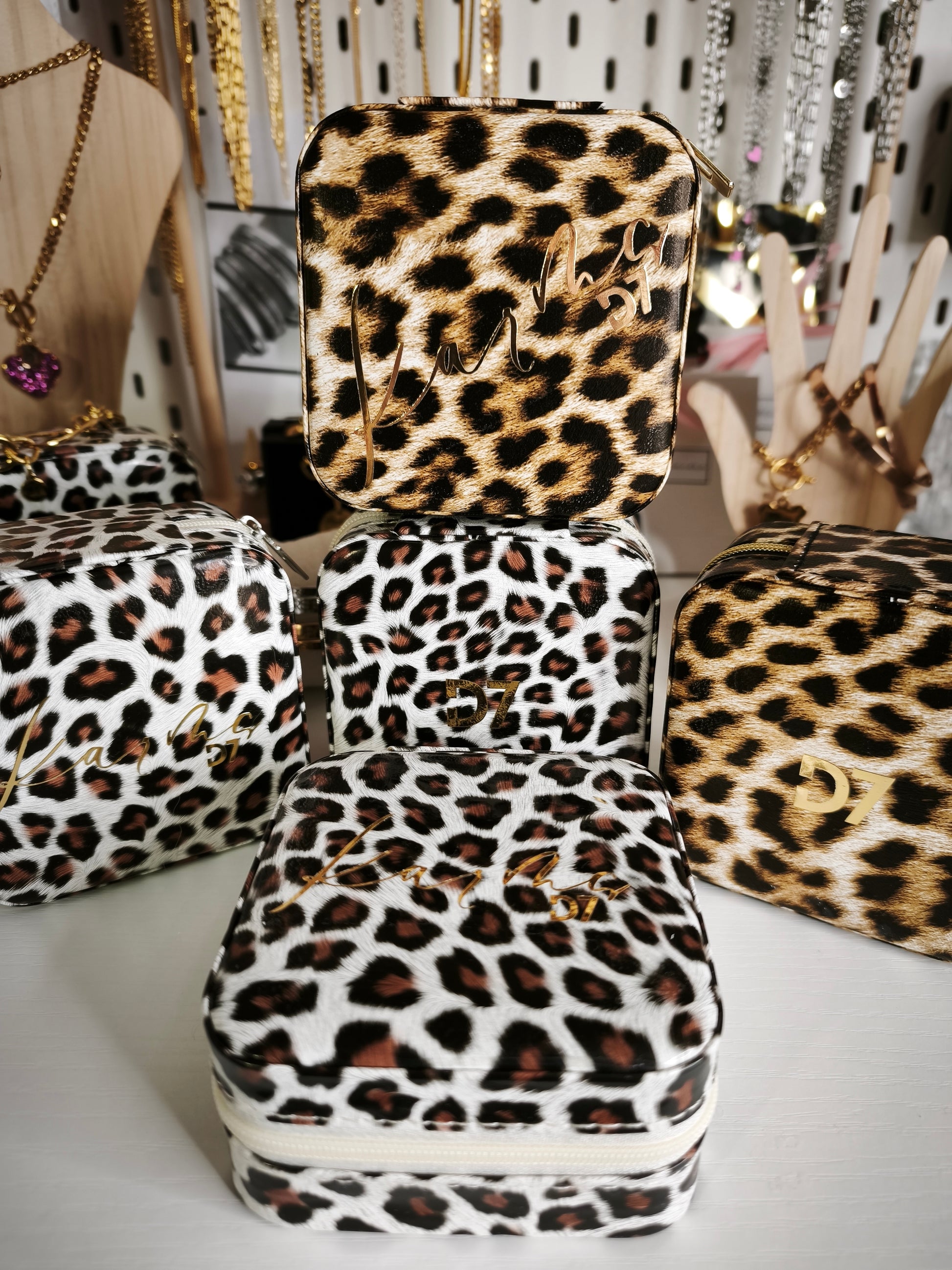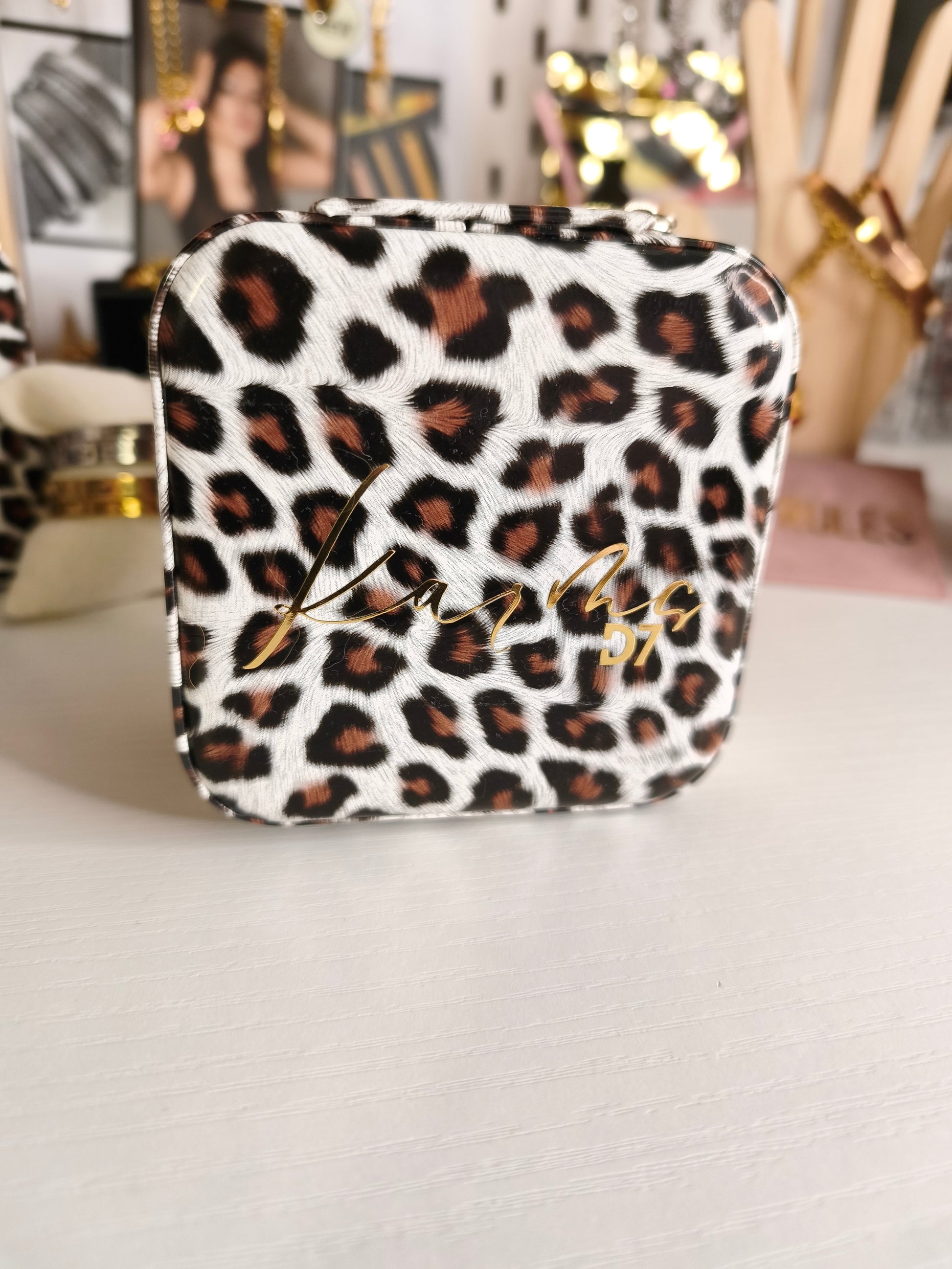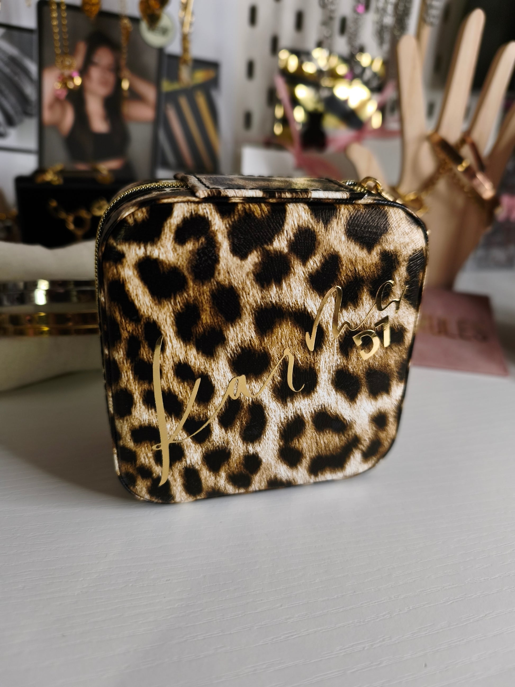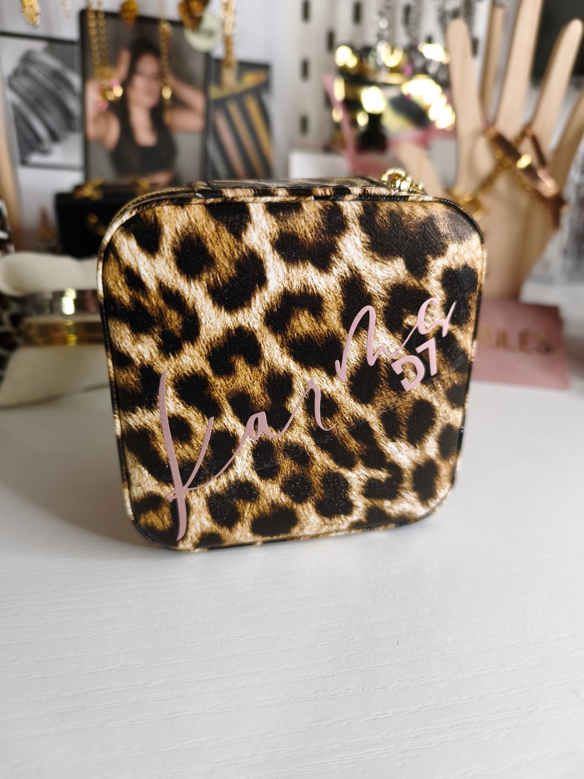 Joyero estampado animal print con impresión de la marca Handmade.