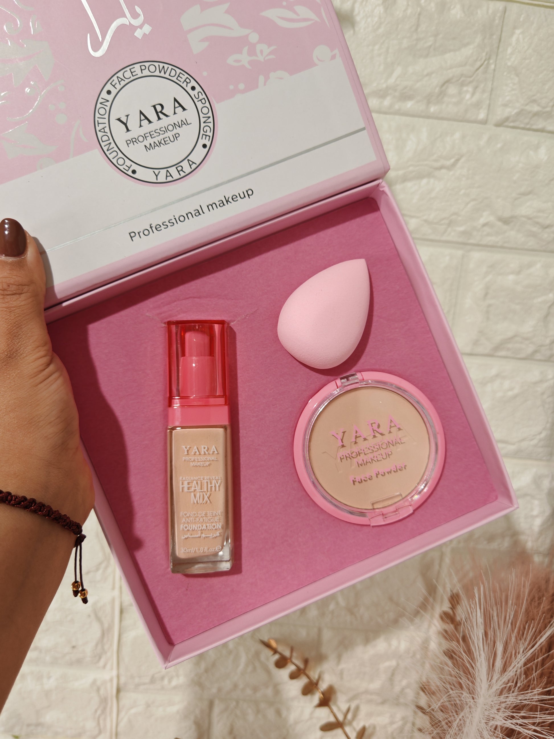 Pack compuesto de base correctora anti fatiga, polvera y beauty blender rosa.
