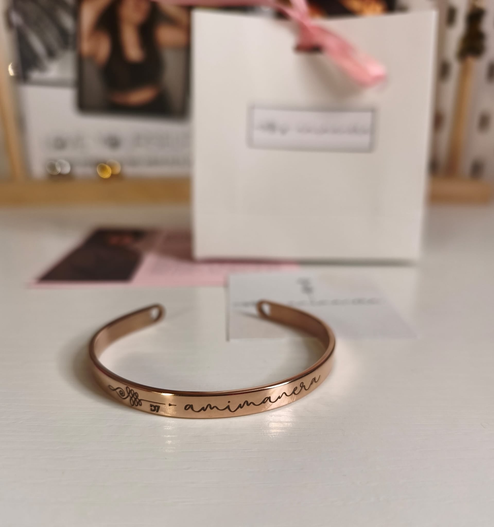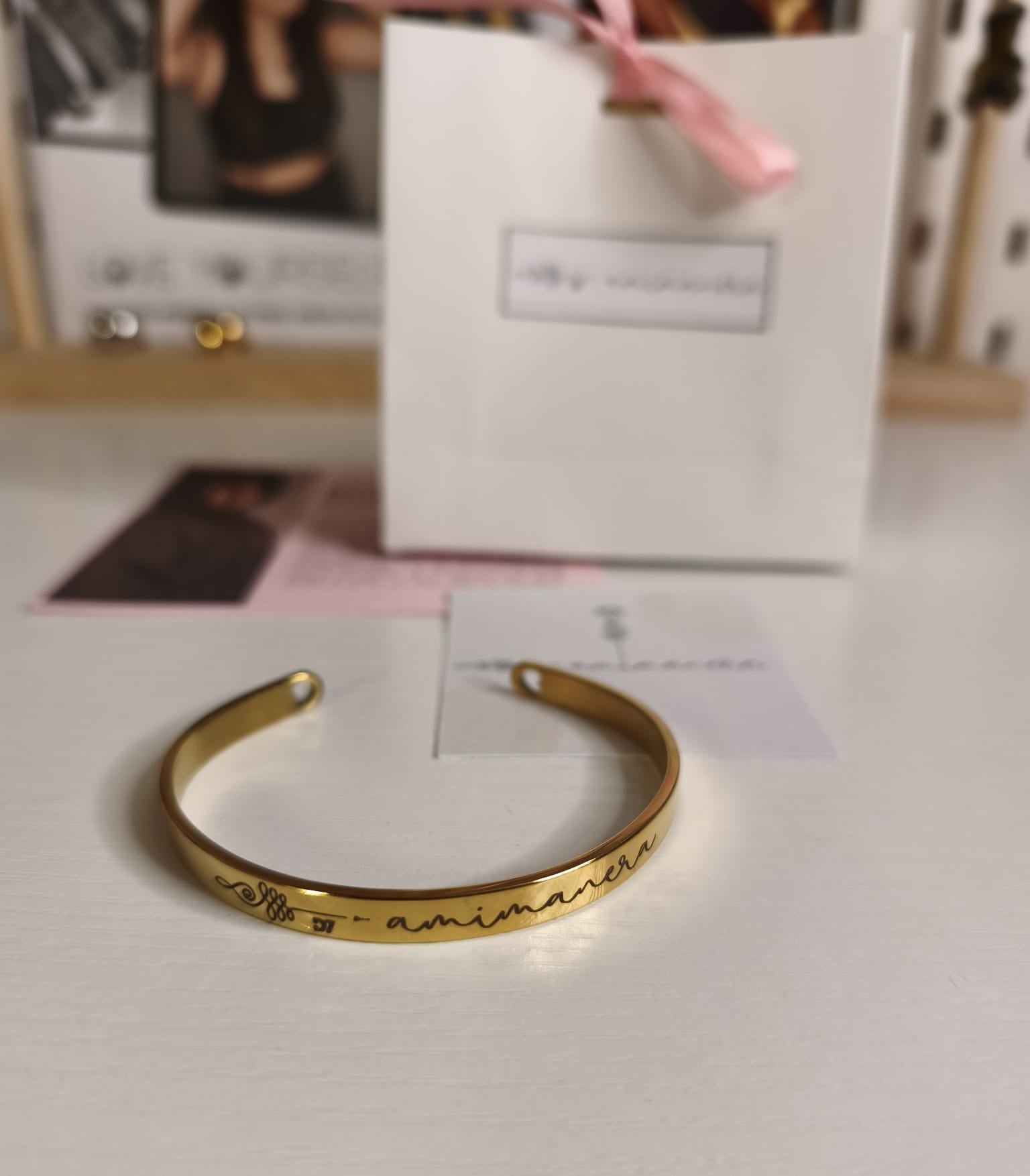 Pulsera rígida en oro con diseño exclusivo AMIMANERA x D7. Presenta un elegante unalome grabado seguido de la inscripción "amimanera", símbolo de transformación y consciencia. Su estructura ajustable se adapta cómodamente a diferentes muñecas, mientras que los terminales en forma de corazón añaden un toque de delicadeza y significado emocional. Pieza versátil que combina simbolismo espiritual con elegancia contemporánea.