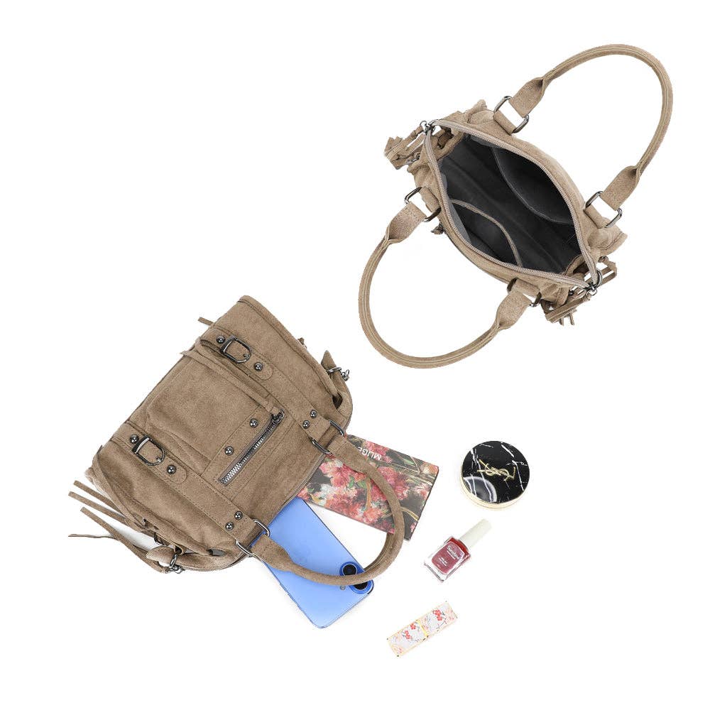 Proveniente de nuestra colección emblemática Skyla, el modelo Skyla Petit Suédine (R-1979-6) combina elegancia desenfadada y suavidad al tacto. Confeccionado en un material efecto ante (imitación gamuza), este bolso seduce por su estilo bohemio y su acabado cálido.