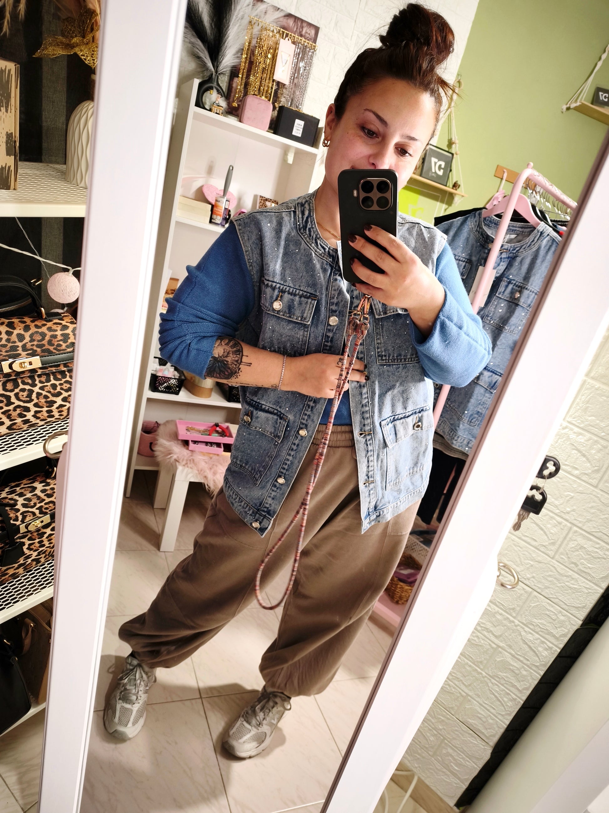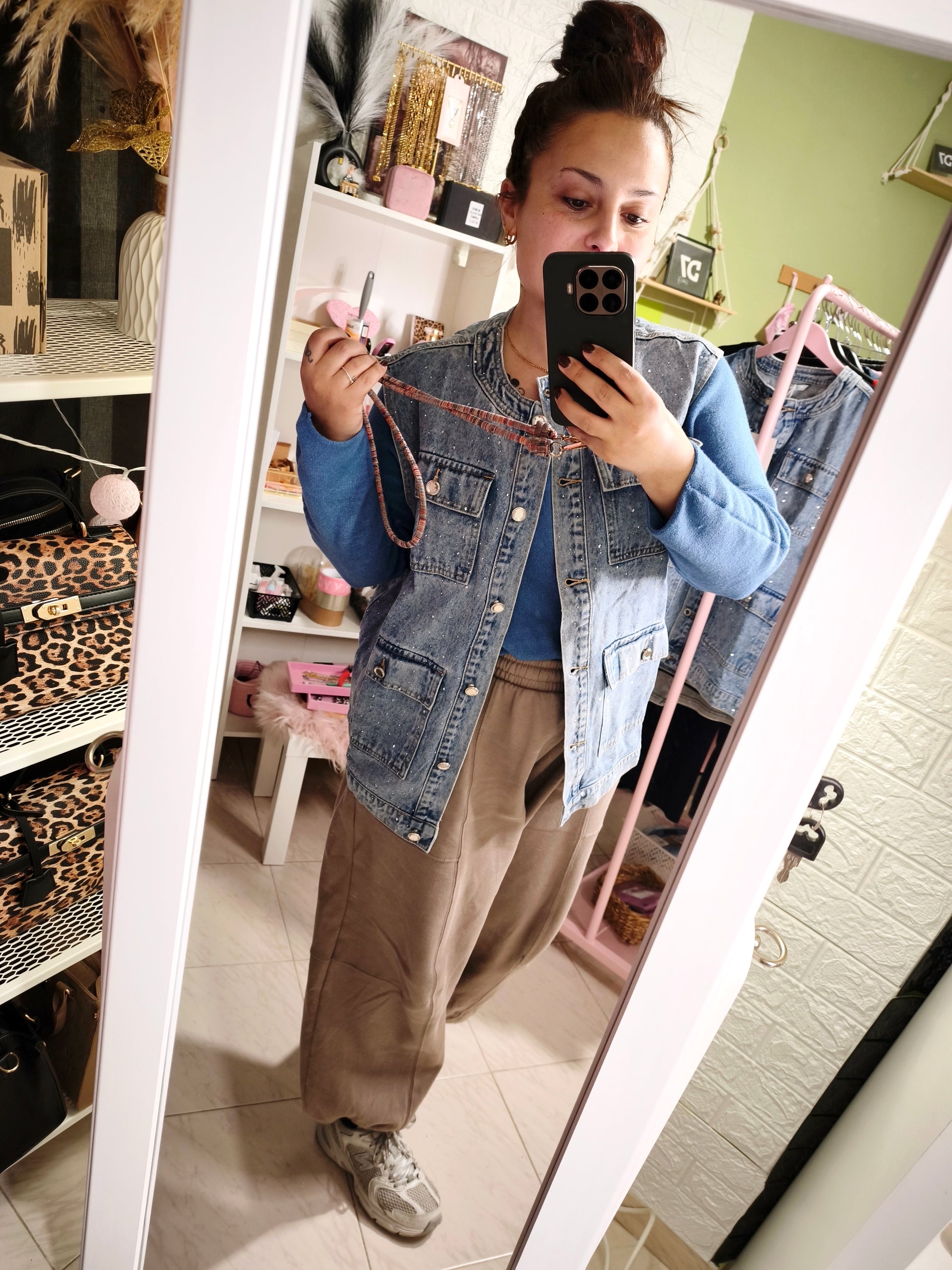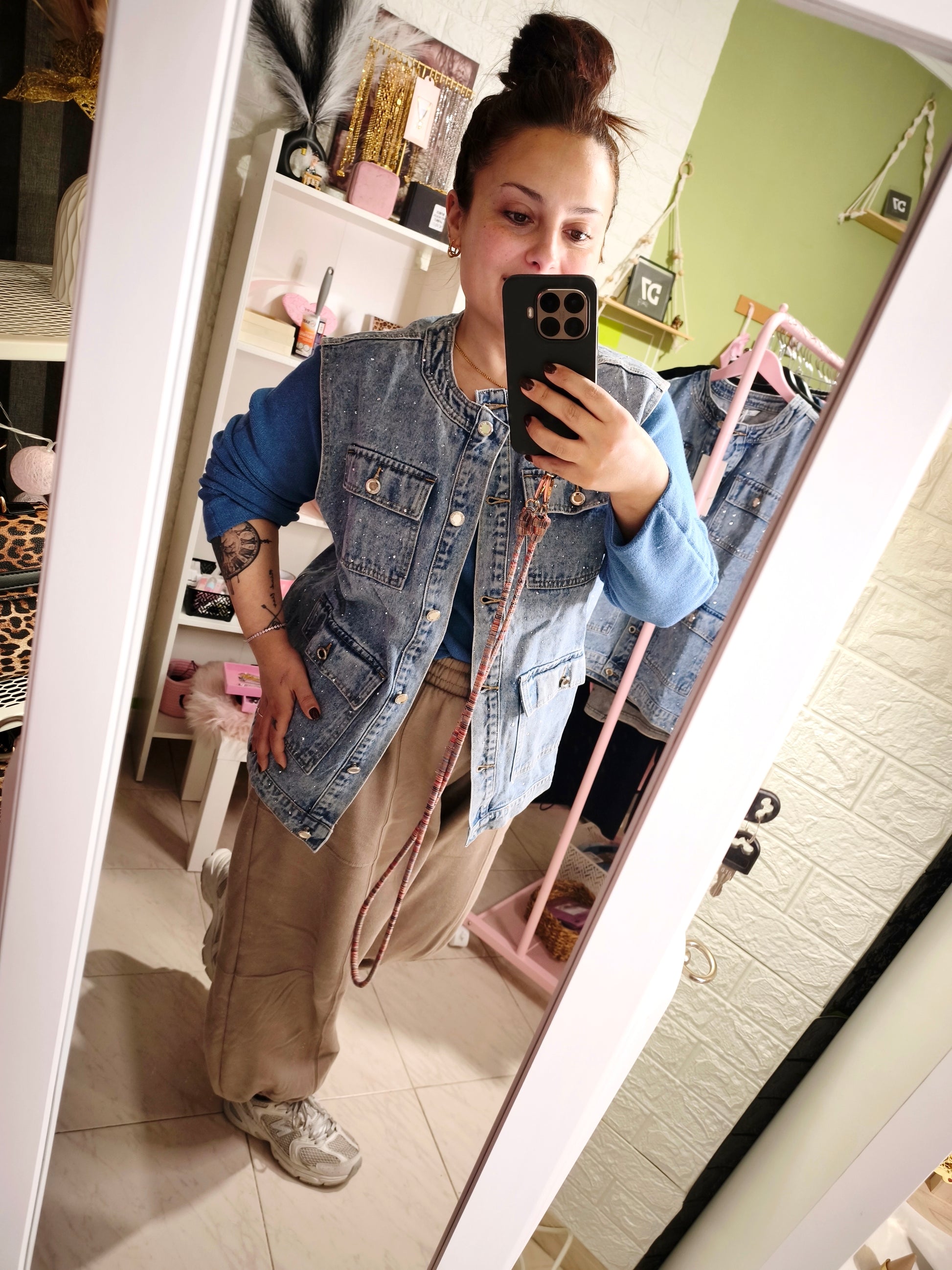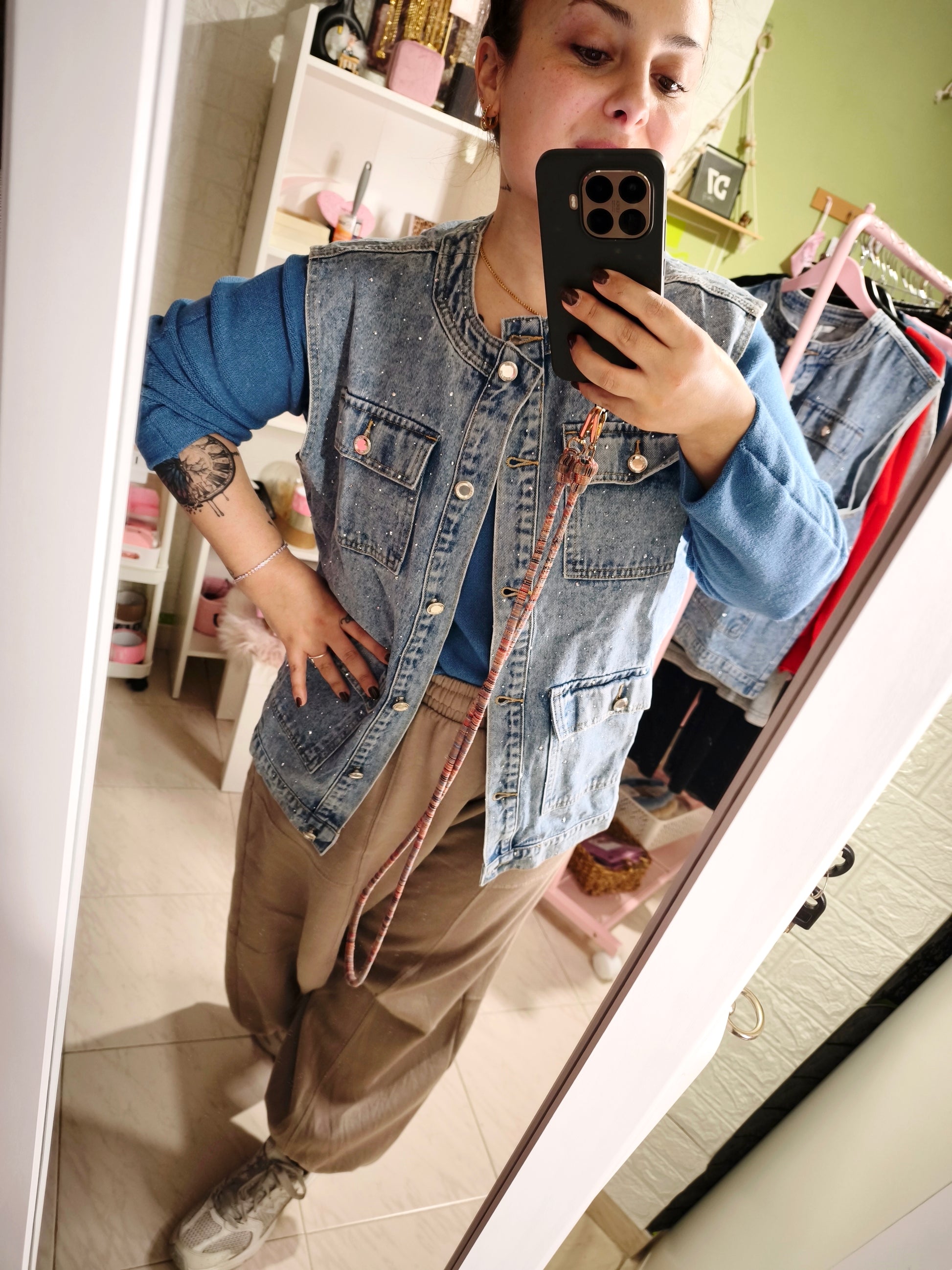 Chaleco vaquero con bolsillos y detalles a lo largo de toda la prenda con sutiles apliques en Strass.