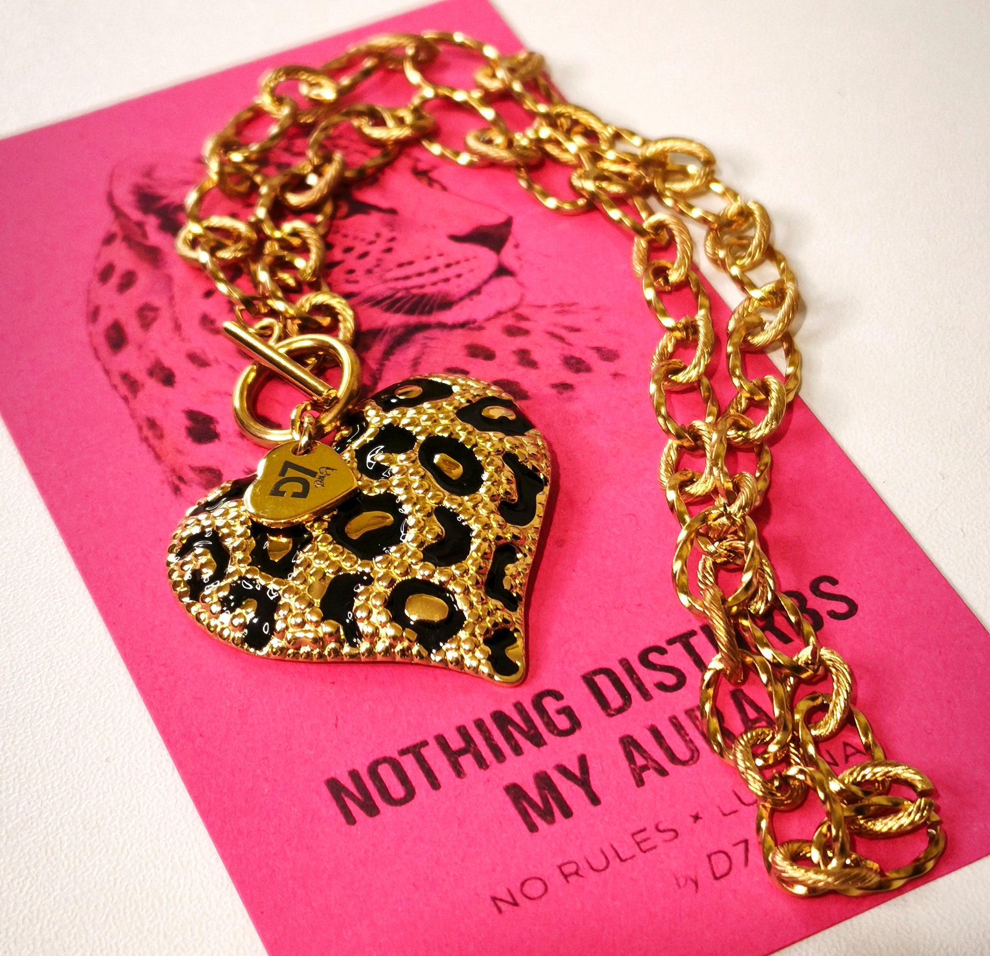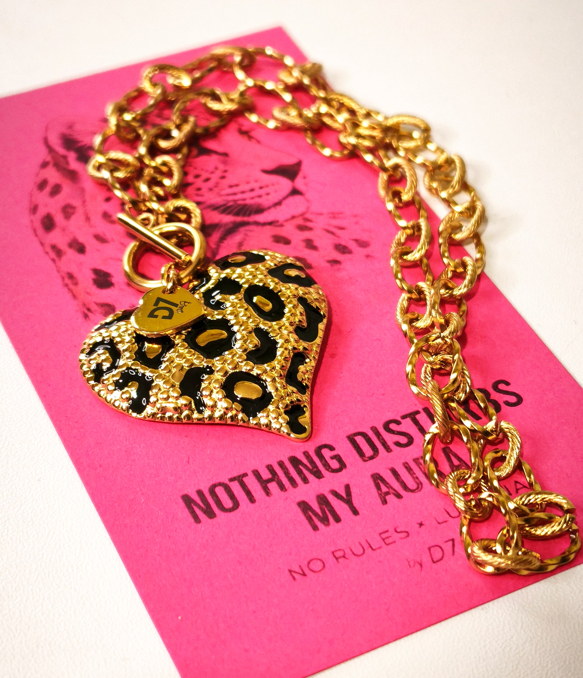 Charm Corazón Print con textura y chapa de la marca grabada.