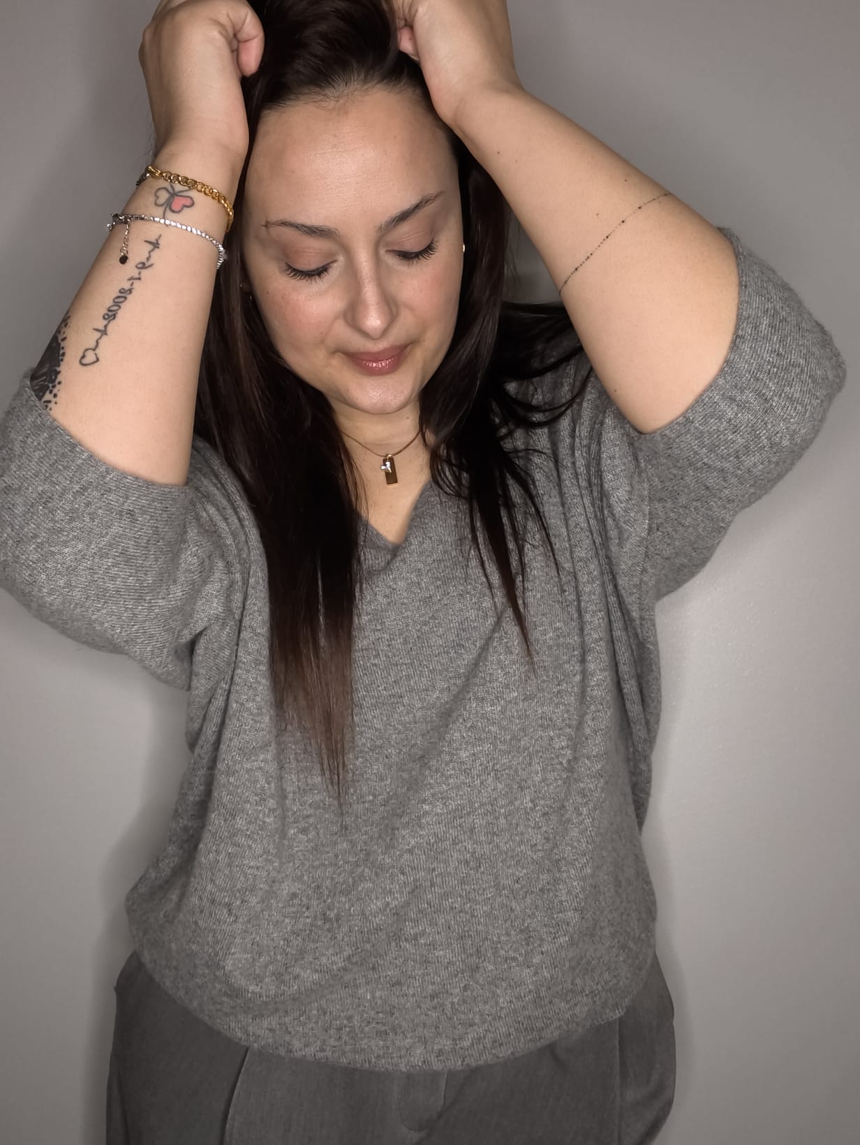 Jersey de punto premium en gris que combina comodidad y elegancia. Diseñado con mangas caídas y escote en pico para un look sofisticado y favorecedor. El corte holgado y la talla única lo hacen versátil para diferentes siluetas, mientras que las mangas tres cuartos ofrecen una proporción moderna. Confeccionado en punto de primera calidad con un tacto suave al contacto, garantiza durabilidad y confort en el uso diario. Una pieza esencial que se adapta a múltiples estilos y ocasiones.