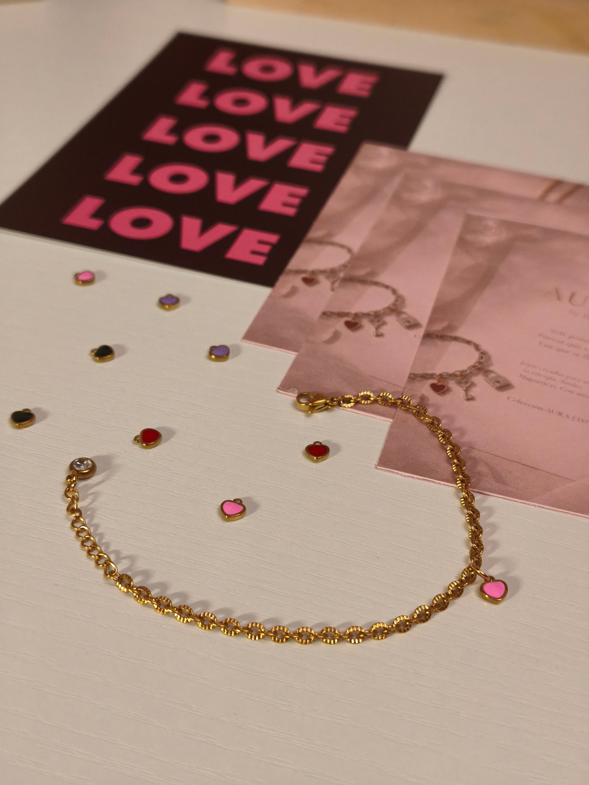 La Pulsera AURA Pink Glow es una joya delicada y luminosa que aporta un toque femenino y alegre a cualquier look. Fabricada en acero inoxidable con acabado dorado, presenta una cadena fina y elegante acompañada de un charm central en forma de corazón esmaltado en color rosa, protagonista del diseño.