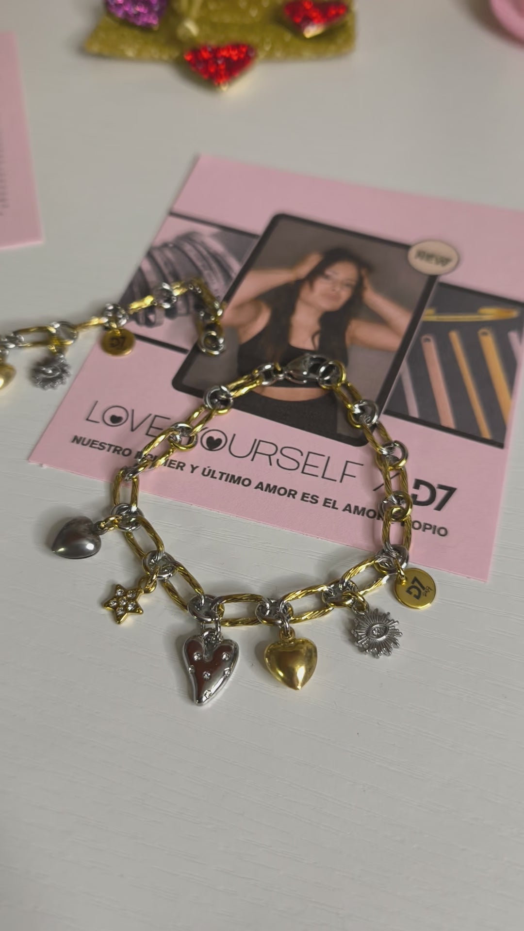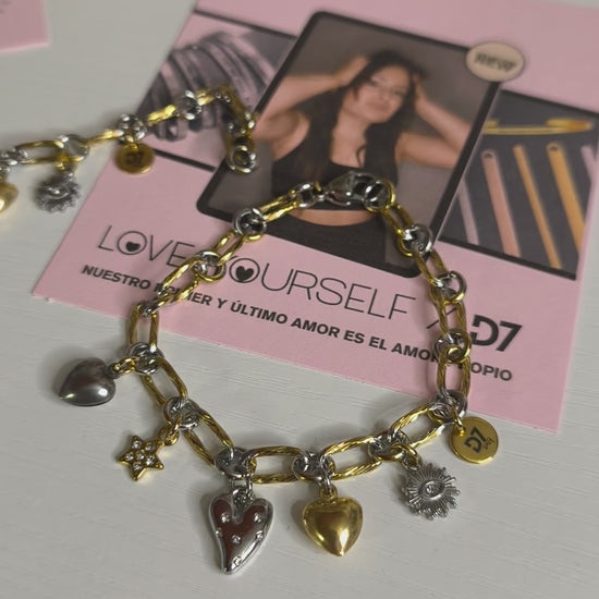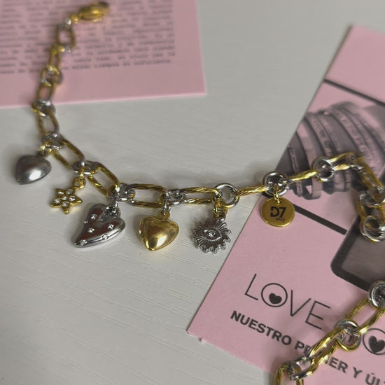 La pulsera Eva es una pulsera especial diseñada con una cadena de acero en mix de plateado y dorado. Sus charms seleccionados transmiten amor propio, fuerza y progreso para que puedas sentir todo el poder de Eva en tu día a día.