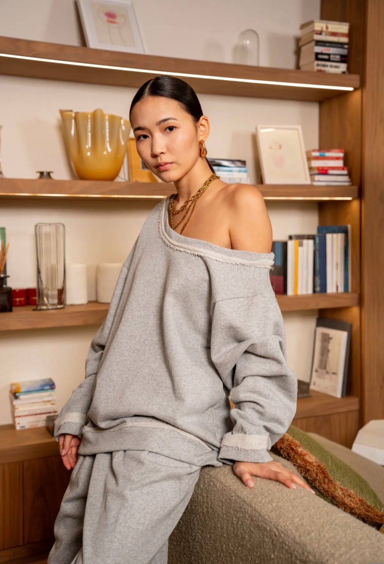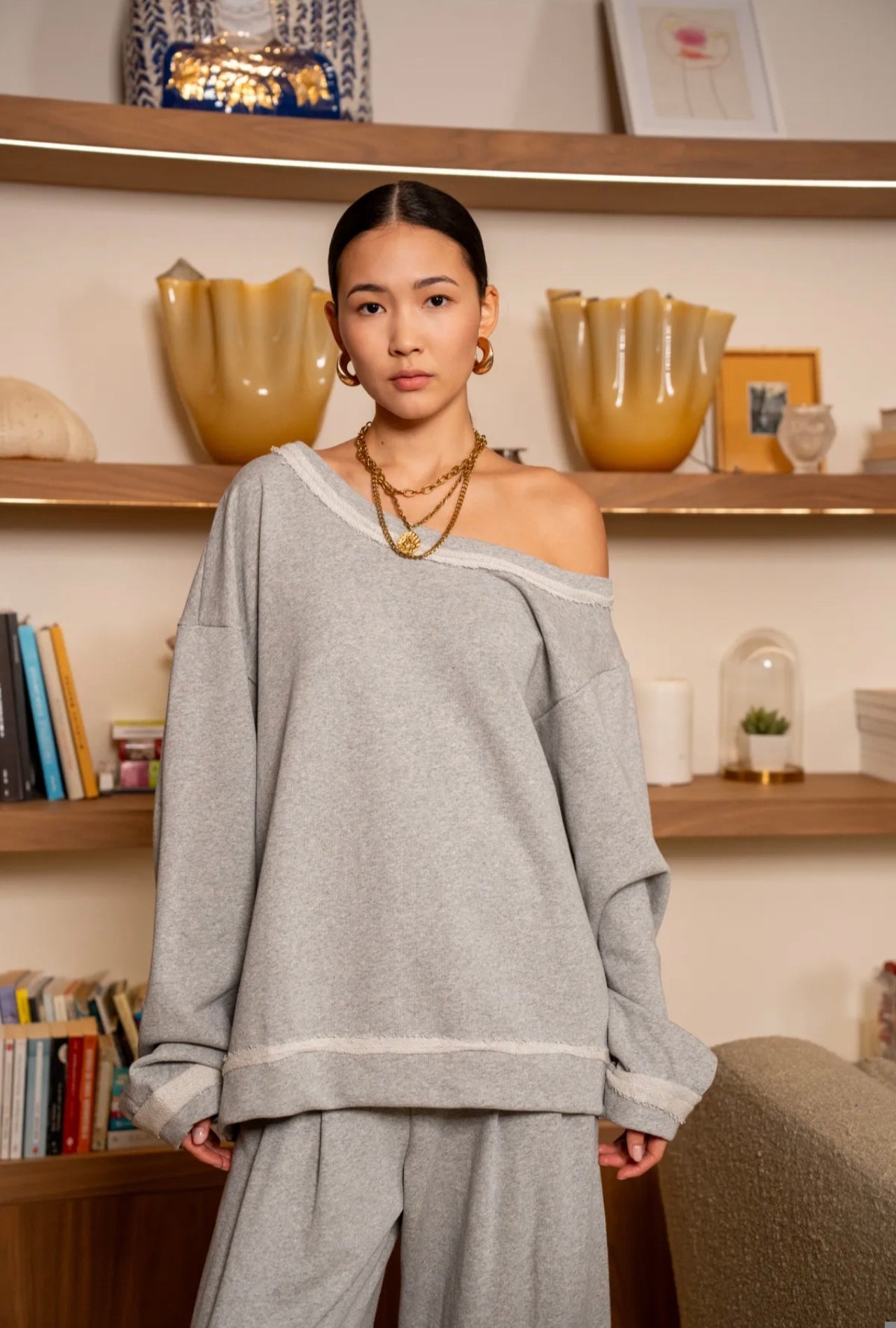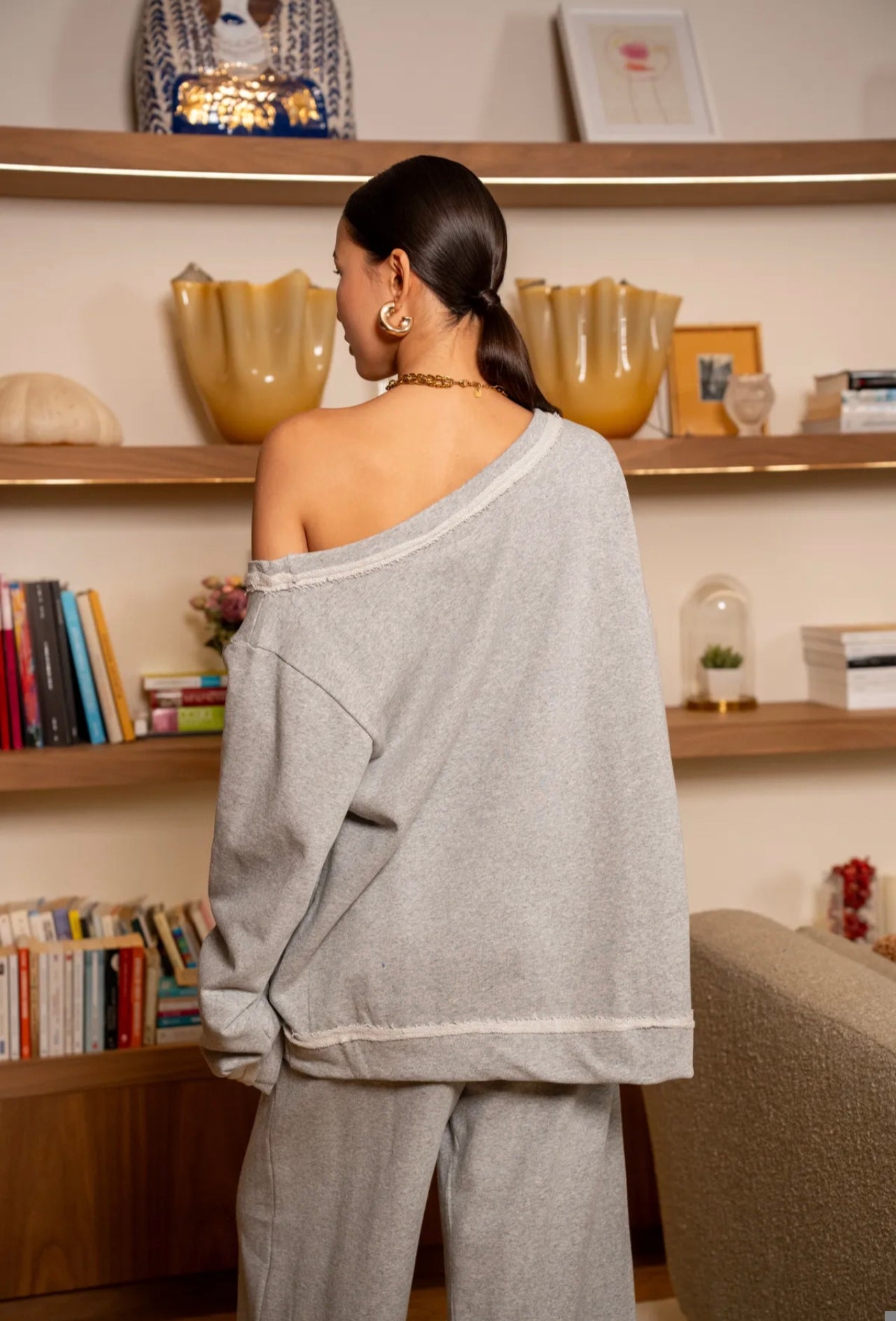 Corte Oversize y escote con hombro al descubierto.