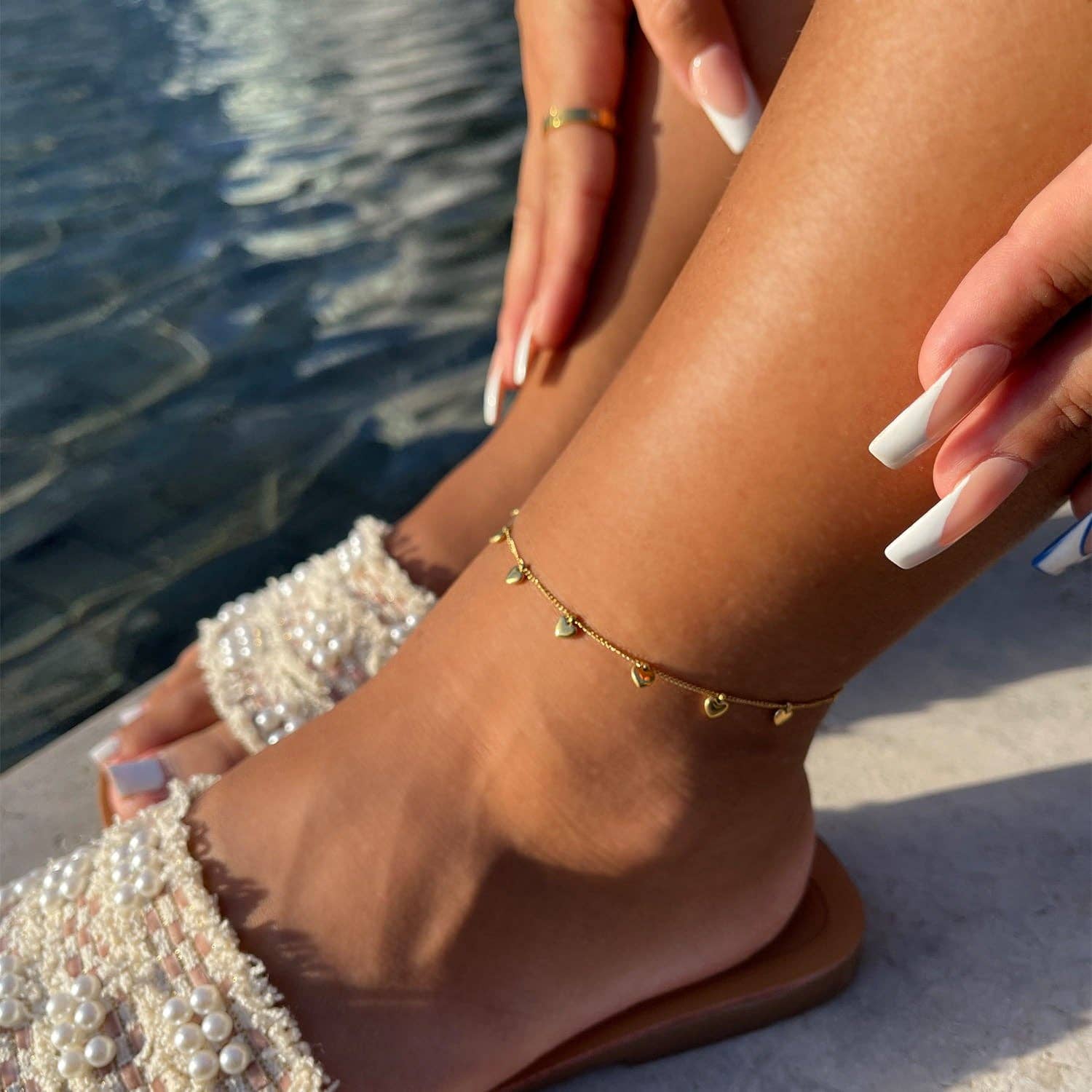 Nuestra tobillera Linda está adornada a la mitad con 7 encantadores colgantes de corazón y a la otra mitad con delicadas bolitas. Toda la tobillera está hecha de acero quirúrgico, por lo que es resistente al agua y a la ducha. Como se puede usar incluso en la ducha, es perfecta para el día a día. Crea tu propio estilo de capas con más tobilleras.